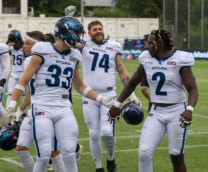 #13 Emil Hovde (DE) Nordic Storm and #6 David Tawake (LB) Nordic Storm celebrate together