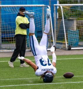 #19 Brendan Beaulieu (WR) Nordic Storm player celebrates in the end zone