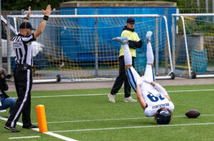 #55 Hugo Dyrendahl (LB) Nordic Storm tackle #24 Chrisman Kyei (RB) Hamburg Sea Devils