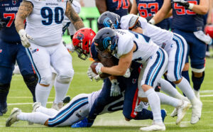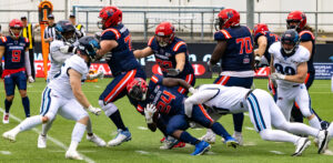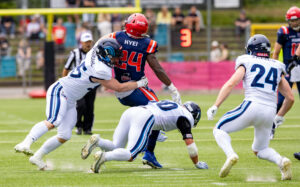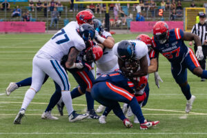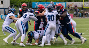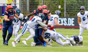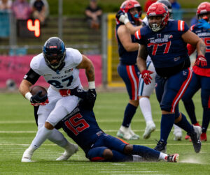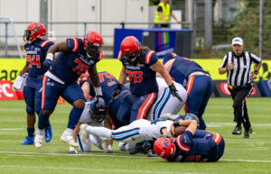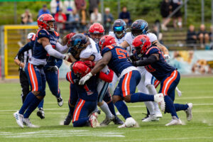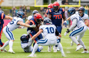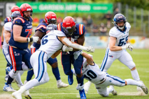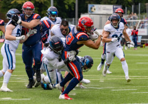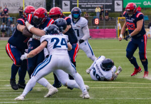 #24 Chrisman Kyei (RB) Hamburg Sea Devils is tackled.