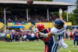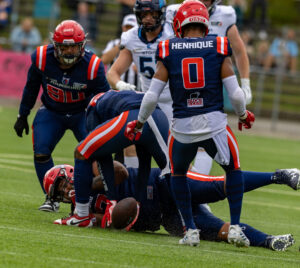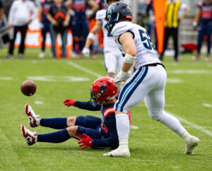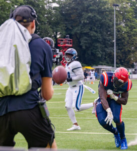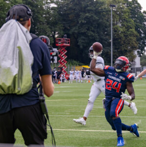 #24 Chrisman Kyei (RB) Hamburg Sea Devils throws the ball and hits the cameraman.