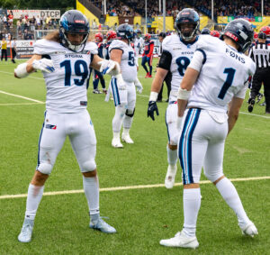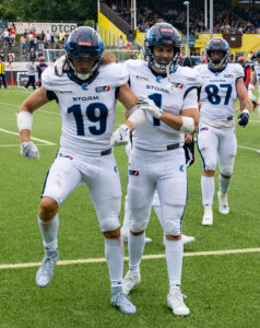 celebrates in the end zone #19 Brendan Beaulieu (WR) Nordic Storm and #1 Simon Føns (WR) Nordic Storm.