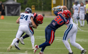#57 Jeremy Sarfo (LB) Hamburg Sea Devils and #25 Lasse Meyer (DB) Hamburg Sea Devils tacklen #87 Adria Botella Moreno (TE) Nordic Storm.
