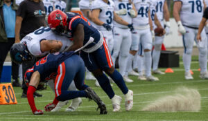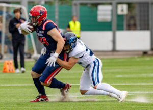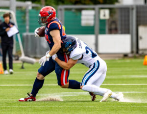 #1 Nazir Streater (DB) Hamburg Sea Devils takle #2 Jordan Genmark (RB) Nordic Storm.