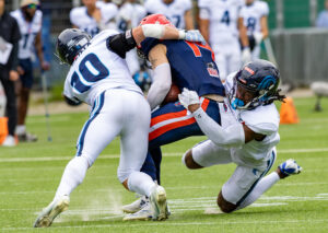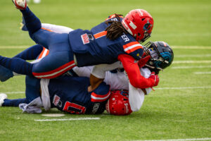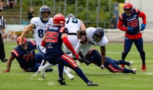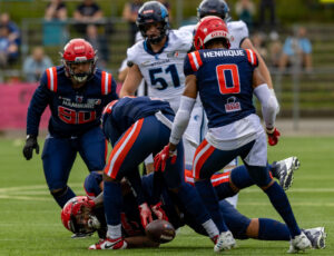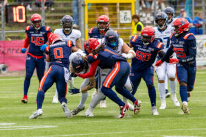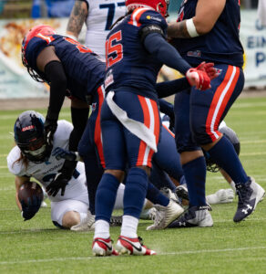 #0 Roedion Henrique (DB) Hamburg Sea Devils and #1 Nazir Streater (DB) Hamburg Sea Devils takle #5 Edvin Taborda (WR) Nordic Storm.