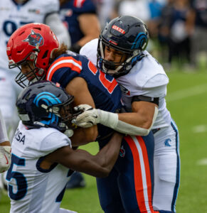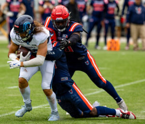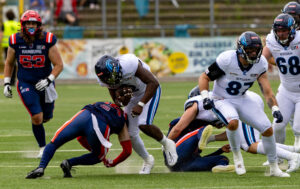 #24 Chrisman Kyei (RB) Hamburg Sea Devils brock the tackle.