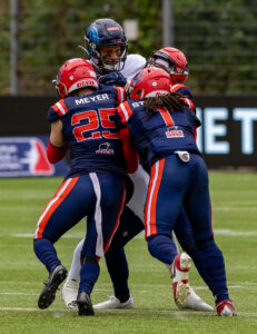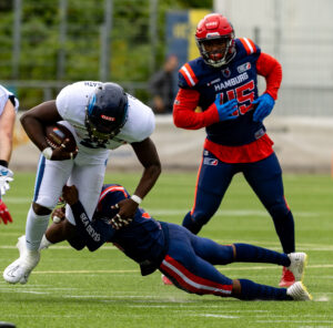#1 Nazir Streater (DB) Hamburg Sea Devils and #25 Lasse Meyer (DB) Hamburg Sea Devils tackle an offensive Player.