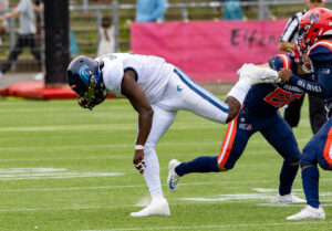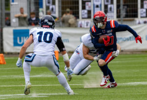 #24 Chrisman Kyei (RB) Hamburg Sea Devils runs down the field after passing the ball.