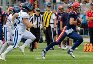#12 Leon Micah (QB) Hamburg Sea Devils run with the ball to sideline.