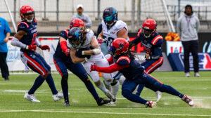 #24 William James (FS) Nordic Storm tackled #44 Levi Kruse (TE) Hamburg Sea Devils