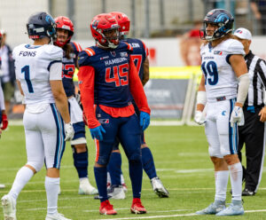 #45 Kyle Kitchens (DL) Hamburg Sea Devils talk with #19 Brendan Beaulieu (WR) Nordic Storm and #1 Simon Føns (WR) Nordic Storm.