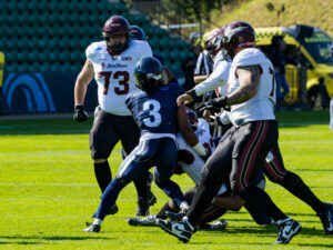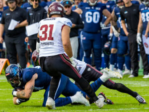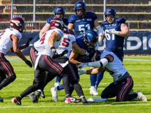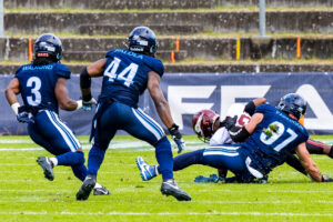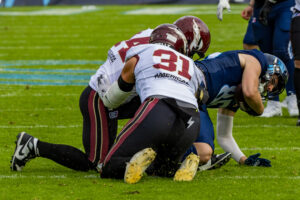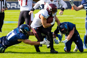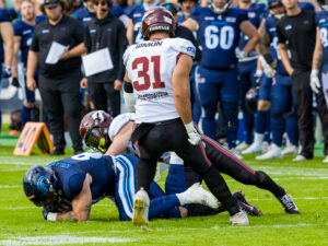 tackle from #31 Flamur Simon (LB) Rhein Fire.