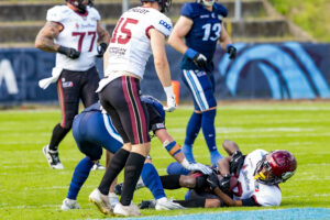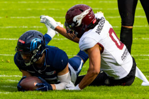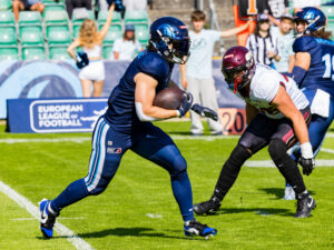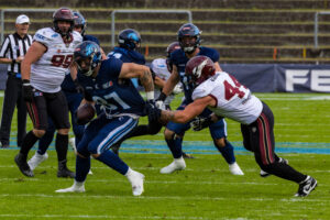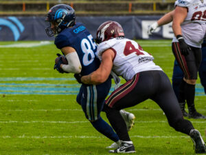 #44 Marius Kensy (LB) Rhein Fire hold on the jersey #87 Adria Botella Moreno (TE) Nordic Storm.