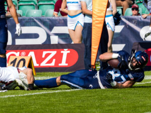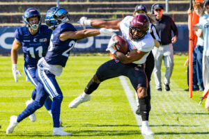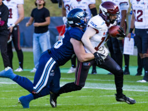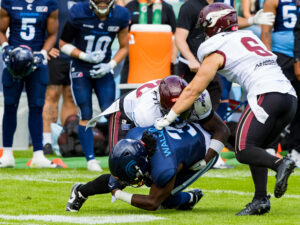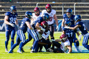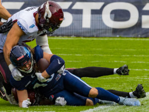 #19 Brendan Beaulieu (WR) Nordic Storm tacklet by Rhein Fire defense.
