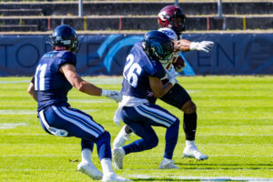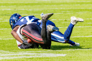 #25 Khalid Adisa (CB) Nordic Storm tackle #10 Harlan Kwofie (WR) Rhein Fire out from the field.