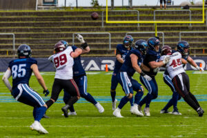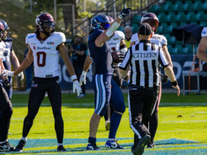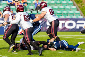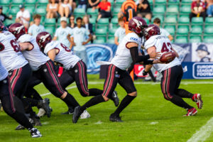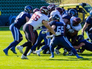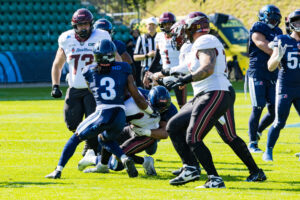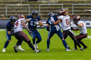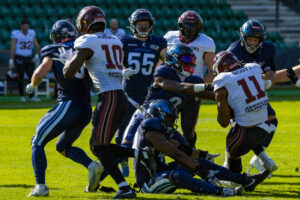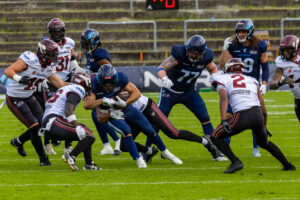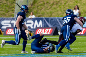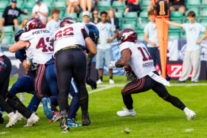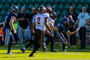 Stop by the nordic Storm Defense at #10 Harlan Kwofie (WR) Rhein Fire at the first down marker. #6 Sergej Kendus (RB) Rhein Fire help with a block.