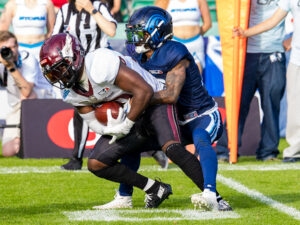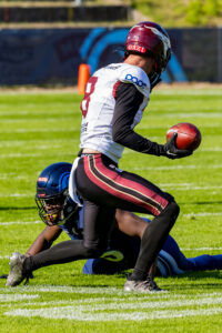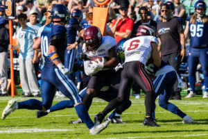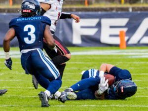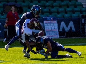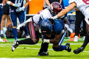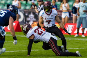 #10 Harlan Kwofie (WR) Rhein Fire tackle by #25 Khalid Adisa (CB) Nordic Storm.