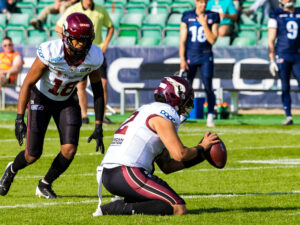 Field Goal try by #18 Eritros Haggi (WR) Rhein Fire and holder #12 Rohat Dagdelen (QB) Rhein Fire.