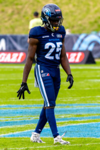 #28 Tyrone (Jordan) Alexander (RB) Rhein Fire fair catch in the endzone.
