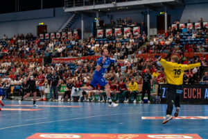 Ein Torwurf von 24 – Lukas Laube – TVB 1898 Stuttgart gegen 12 – Mohamed El-Tayar Handball Sport Verein Hamburg