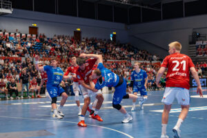 21 – Frederik Bo Andersen Handball Sport Verein Hamburg und 9 – Jacob Lassen Handball Sport Verein Hamburg versuchen den Angriff von 9 – Gianfranco Pribetić – TVB 1898 Stuttgart und 44 – Lenny Rubin – TVB 1898 Stuttgart zu stoppen.