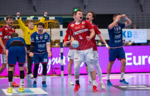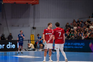 Siegesfeier von 4 – Jonas Loeser (Löser) SG BBM Bietigheim und 7 – Leif Tissier Handball Sport Verein Hamburg