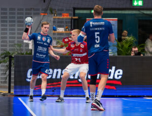 Angriff von 3 – Nikola Vlahovic SG BBM Bietigheim gegen die Verteidiger 7 – Leif Tissier Handball Sport Verein Hamburg und 21 – Frederik Bo Andersen Handball Sport Verein Hamburg