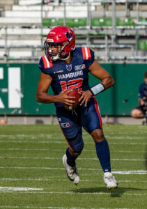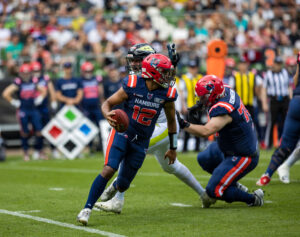 #12 Taulia Tagovailoa Hamburg Sea Devils beim ausweichen gegen die Defense der Stutgart Surge.