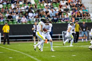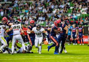 #12 Taulia Tagovailoa Hamburg Sea Devils gibt sich mit dem Lauf auf da schon #24 – Mitchel Fettig Stuttgart Surge und #94 – Berend Grube Stuttgart Surge